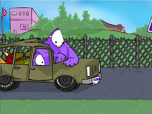 1、在狂扁小朋友手机版游戏的开始,便是大力士开着车带儿子来幼儿园;