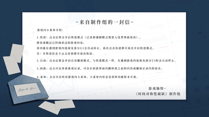 2、然后可以看一下来自制作组的一封信;上面有写本次剧情开放的部分、游戏内部分已开放的功能介绍以及游戏内小菜单的介绍;