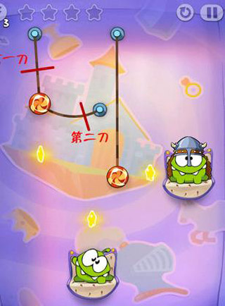第三关:先把最左边的绳子切断,让其撞击右边的糖果,如此即可过关。