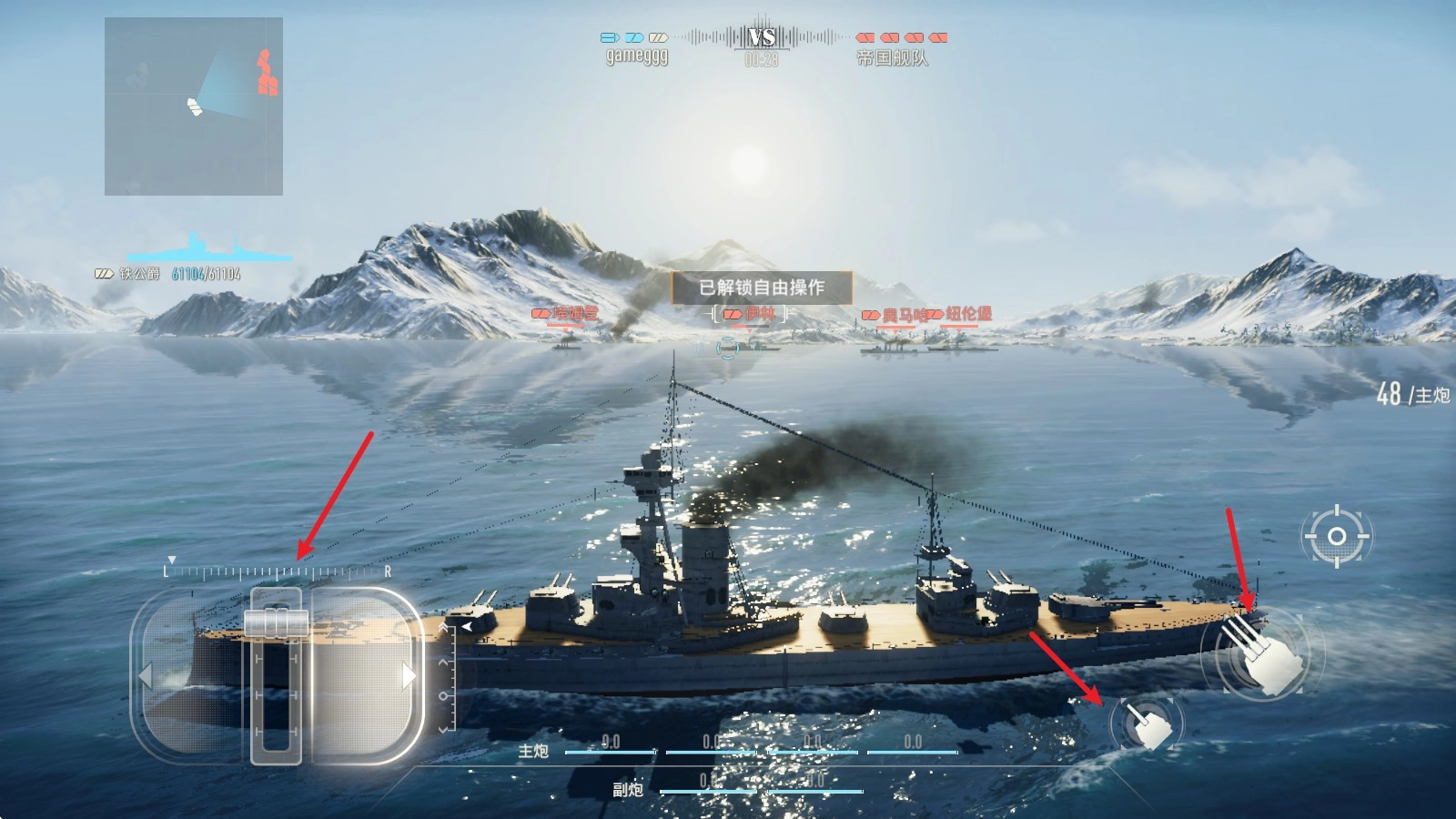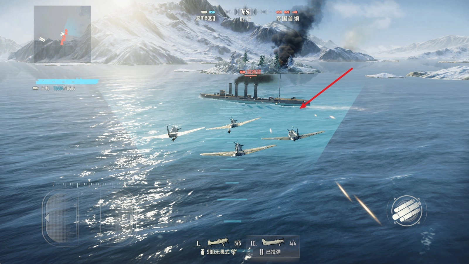 5、接下来我们就能操控战舰发起攻击了,和操作飞机类似,左侧负责控制移动,右侧则用来操控主炮与副炮进行射击。
