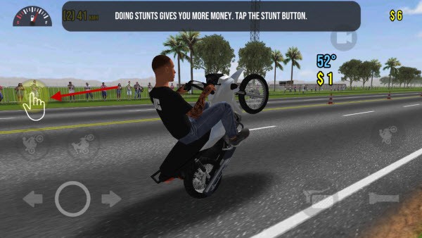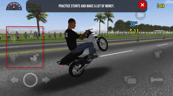 1、游戏内,通过点击左下角按钮来让摩托车翘头驾驶。