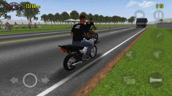 通过虚拟按键进行操控。屏幕左下方是左右转弯按键;屏幕右边第一个按键可使摩托车头翘起来,与驾驶键一起按能实现车头翘起前进的特技,长按此键还会出现三个指定特技动作;屏幕右边下方第一个是摩托后退键,第二个是正常驾驶键。