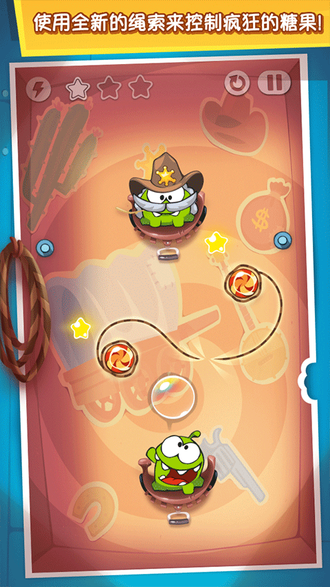 ◆游戏中,玩家要剪断绳子,让糖果可以将周围的星星击破又能进入Om Nom 嘴巴。