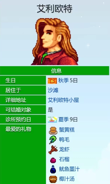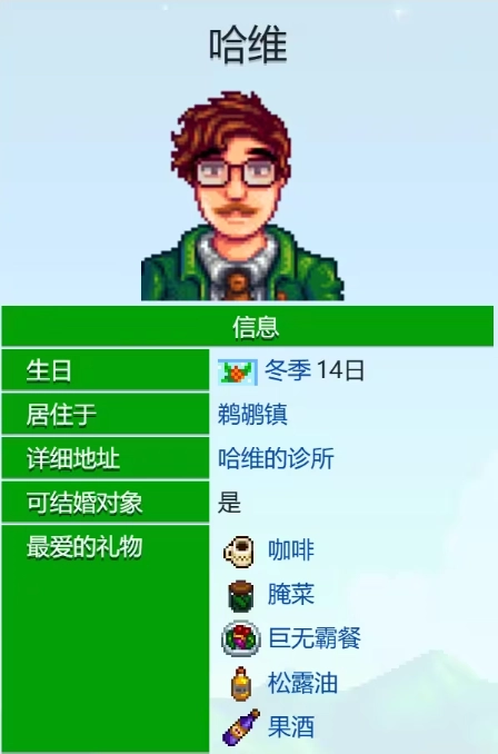 3、哈维喜好:果酒、巨无霸餐、松露油、咖啡、腌菜、五彩碎片、兔子的脚、珍珠、黄金南瓜、魔法糖冰棍。