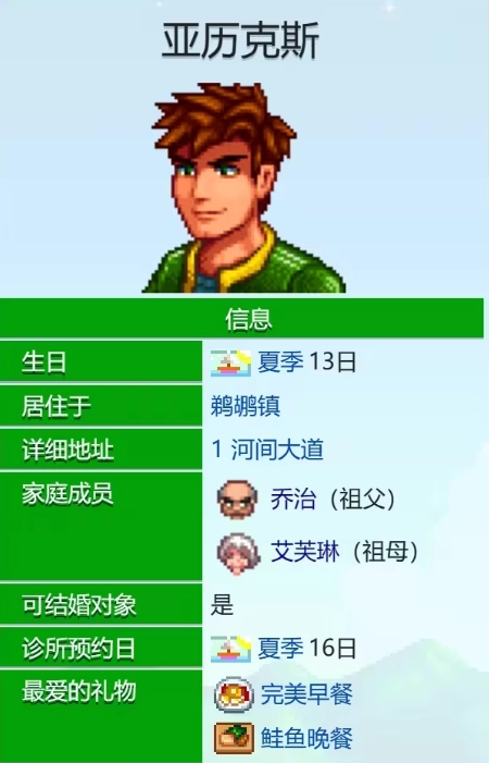1、亚历克斯喜好:咖啡、苹果、杏子、橙子、桃子、石榴果子、樱桃、枫糖浆。