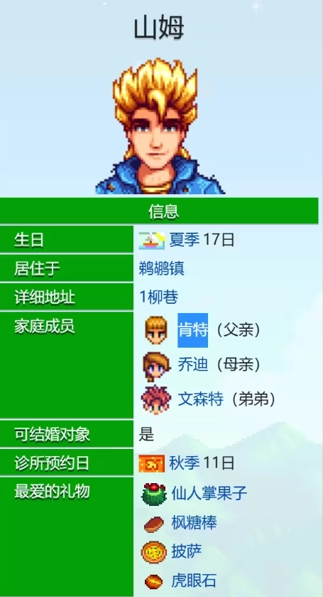 4、山姆喜好:仙人掌果子、披萨、虎眼石、枫糖棒、五彩碎片、兔子的脚、珍珠、黄金南瓜、魔法糖冰棍。