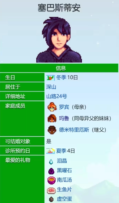 5、塞巴斯蒂安喜好:泪晶、生鱼片、南瓜汤、黑曜石、虚空蛋、五彩碎片、兔子的脚、珍珠、黄金南瓜、魔法糖冰棍。