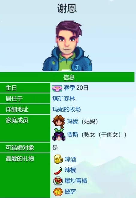 6、谢恩喜好:披萨、爆炒青椒、辣椒、啤酒、五彩碎片、兔子的脚、珍珠、黄金南瓜、魔法糖冰棍。