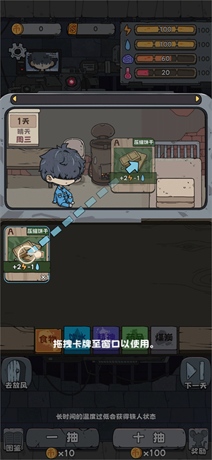 抽卡获取资源:玩家需要通过抽卡来获取生存所需的资源,如食物、水等,同时还可以获得各种卡牌。