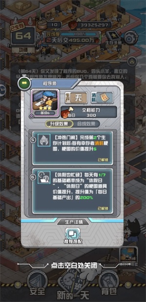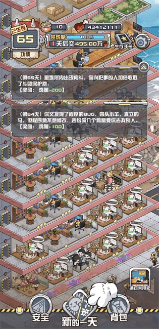 2、模拟经营:游戏结合了模拟经营元素,玩家需要经营自己的避难所,对资源进行有效管理。通过不断优化和升级避难所,玩家可以提升生存概率和舒适度。