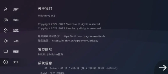 在关于设置界面,玩家可以查看许可协议和隐私政策,以及快速查看系统信息,以便向官方提交BUG。