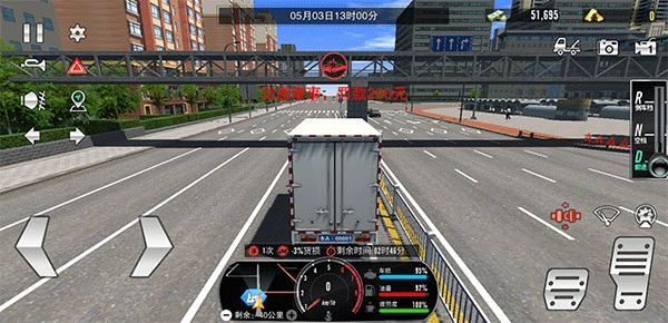 在运输途中,玩家需借助下方地图指引前往运输终点。行驶时务必系好安全带(其对应刹车上方的红色图标),同时要遵守交通规则,避免发生撞车等事故。否则,不仅会面临罚款,还会导致货物损坏。