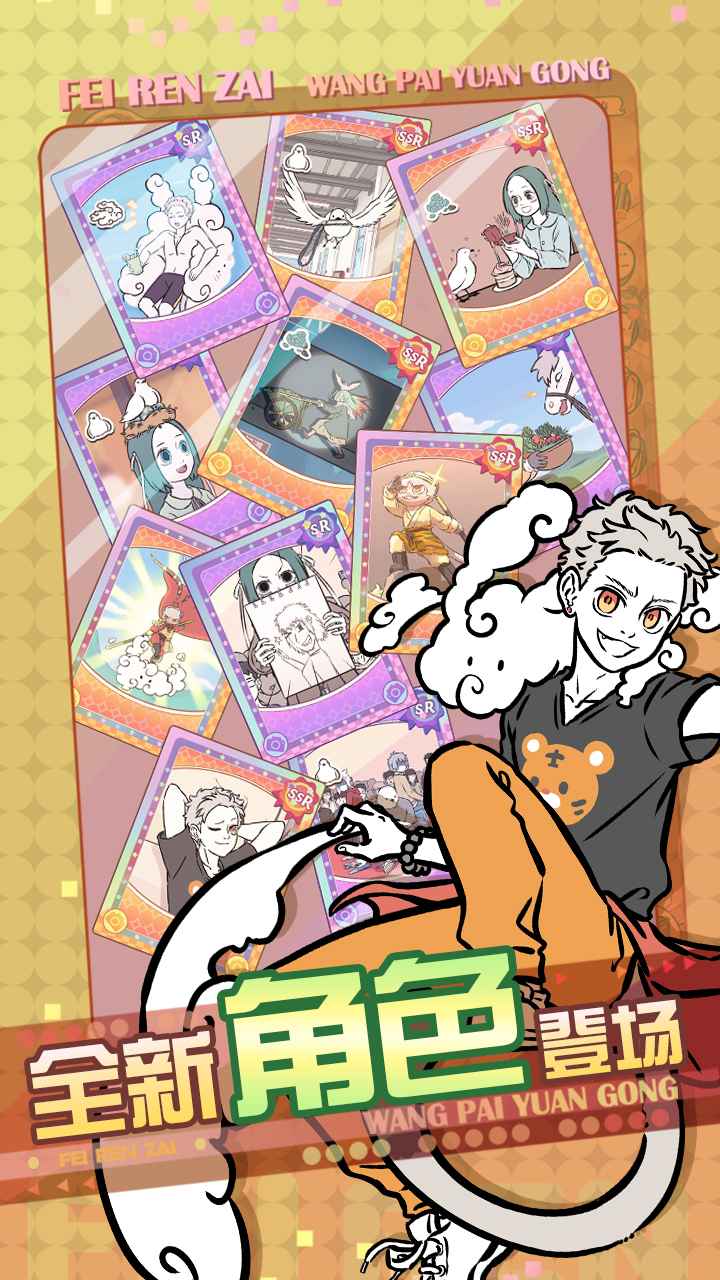 一款卡牌养成游戏。在游戏内完美还原了非人哉诸多名场面和角色,在这里你可以看到可爱的九月、反差感极大的精卫、有洁癖的大士,以及对毛茸茸过敏的二郎神。且玩家还可以通过完成游戏内的任务和活动等方式来获取他们,来与他们一起征战异兽。