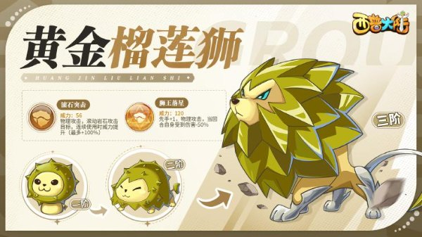 ○黄金榴莲狮○小时候是性格温和,不具攻击性的小狮子,会习惯将身体缩进外壳以保护自己免受伤害,和同样喜欢咕噜咕噜滚动的泥球仔是最好的朋友。它钟爱在布满沙粒的地方伪装成仙人掌,却总会被自己的尾巴出卖,被发现时,总会引起好友哈哈大笑。后来成长为榴莲狮群中的王者,习惯屹立在高山上凝视远方,此时它浓密的毛发会反射出极其闪耀的光芒。