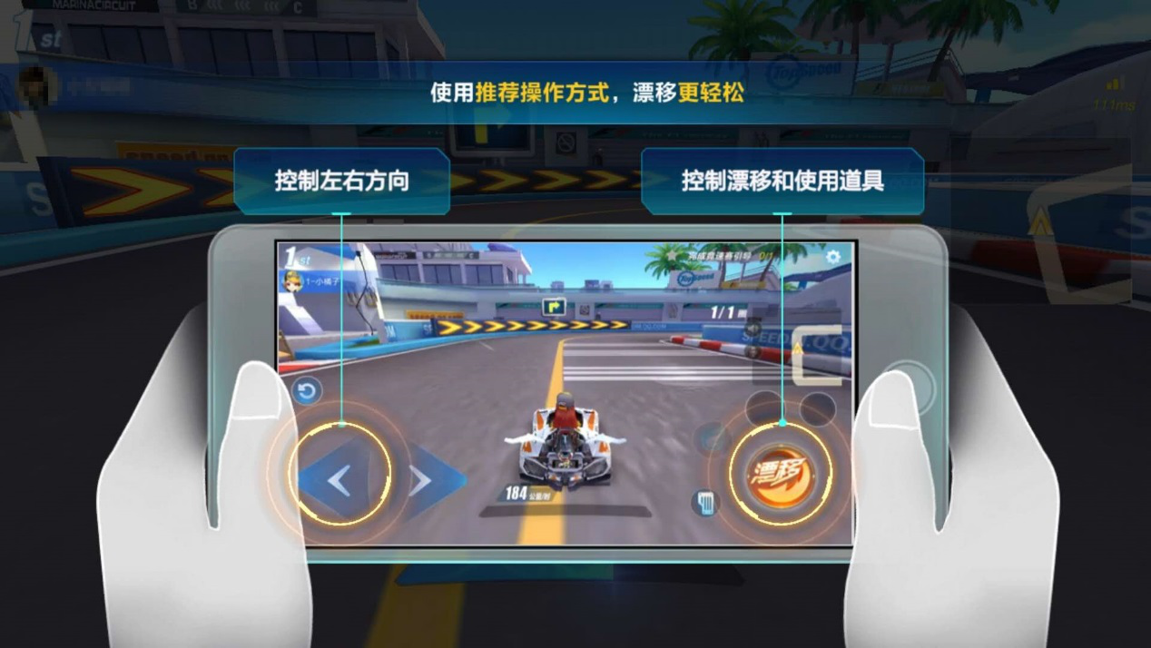 双手横屏控制手机,默认的操作方式为:左手控制左右方向,右手控制漂移和使用道具。