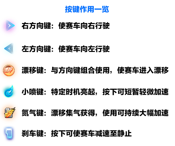 你可以通过多个按键,改变赛车方向、进行漂移、加速、使用道具等操作,并通过特定的按键组合触发双喷、CWW喷、侧身漂移等更多技巧!