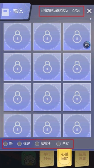 4、在“笔记”页面的下方还有黄色的便签,剩下的是“心跳回忆”和“结局收集”;