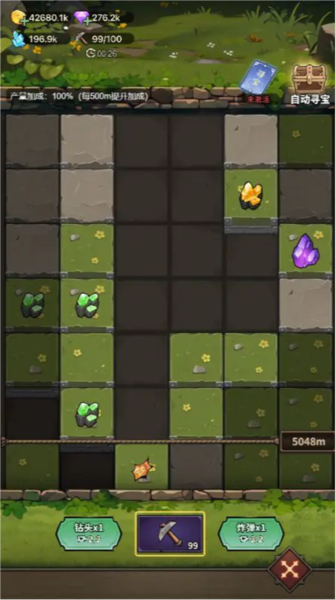 三、洞窟寻宝玩家使用镐头前往洞窟寻宝,每消耗一个镐头可消除洞窟障碍,消除到有资源的的地方,可获得资源(主要获取冥想晶石)。镐头未达到上限前会随着时间满满恢复,直到上限值。在消除洞窟障碍时,也可以使用钻头和炸弹,消除一大遍,获取更多资源。