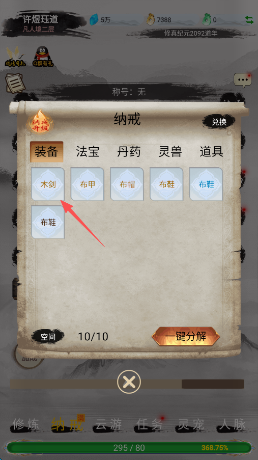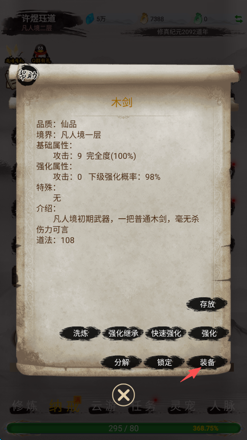 8、随后点击屏幕右下角的“装备”,依次将所有的装备全都装备上就行了,游戏前期基本就无忧了。