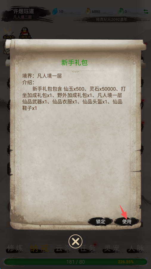 6、点击屏幕右下角的“使用”,就可以获得基础的装备了,记得装备,不要使用完礼包就忘了。