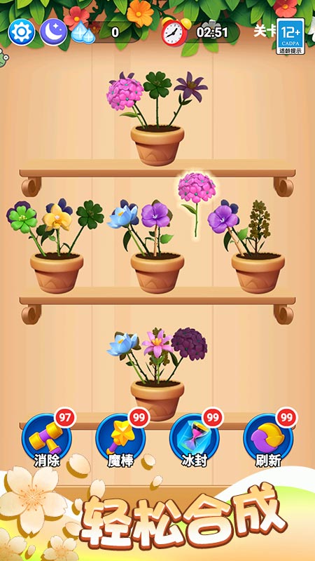 2、操作轻松简单,只需拖动花朵归位,集齐三朵同款就可以自动消除,上手零门槛。