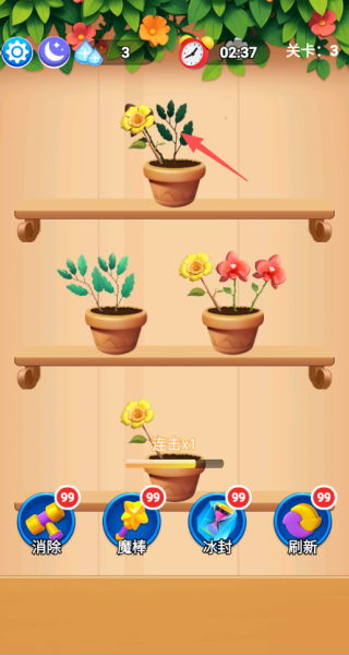 1、通过拖拽合并相同品种的植物,当三朵相同花朵相邻时会自动合成高级品种并消除。