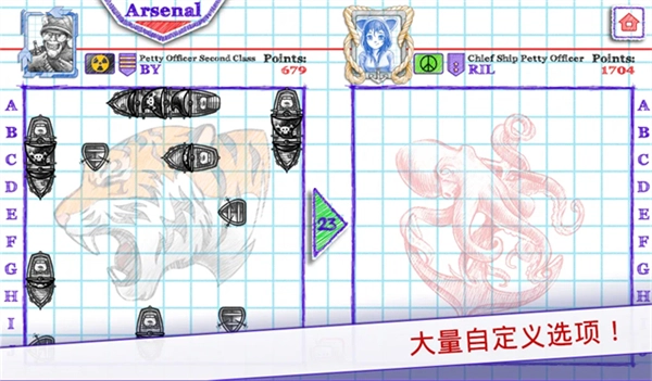 在网格区域部署己方舰船,把右侧的舰船道具放置到左侧网格的合适位置,完成布局准备工作。