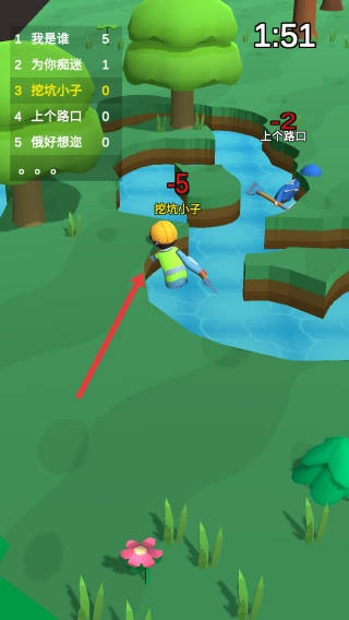 互坑生存玩法:滑动屏幕挖坑阻挡对手,自身体型会随着挖坑数量的增加而变大,这会导致移动速度减慢,所以需要在“挖坑封路”和“灵活躲避”之间权衡策略。