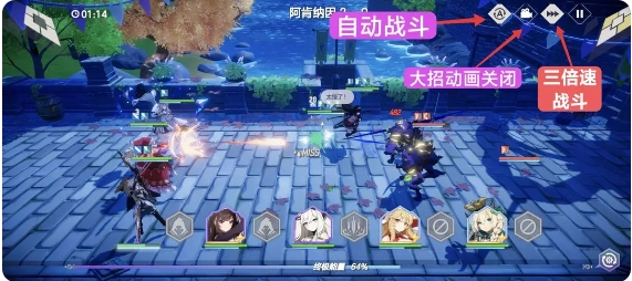 战斗画面可以设置自动战斗,选择三倍速,精灵大招技能动画分3层次关闭。
