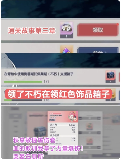 选饰品看好属性拿,秋要敏捷爆伤,其他主C看攻略选择对应属性套装!我给秋选了力量爆伤只能给光辉带了(哭晕厕所了)