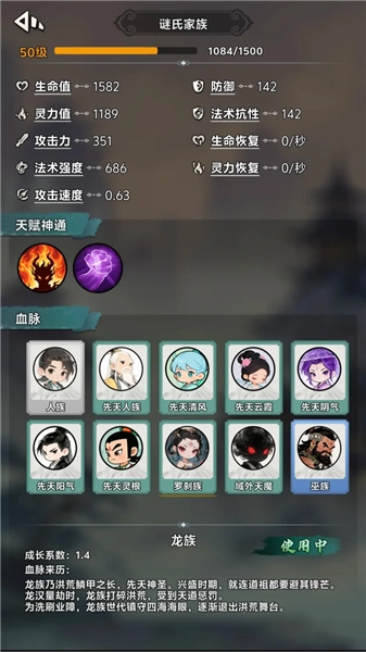 在角色界面中,能够查看生命值、灵力值这类属性,还可以挑选不同的血脉(例如龙族),并且每种血脉都具备独特的成长系数与背景故事。