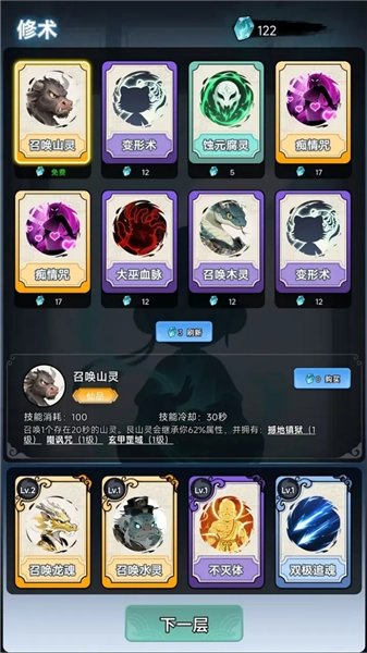 在修术界面挑选并购置技能卡牌,像召唤山灵、变形术这类,以此拓展战斗方式,完成后就能前往下一层继续探索冒险。