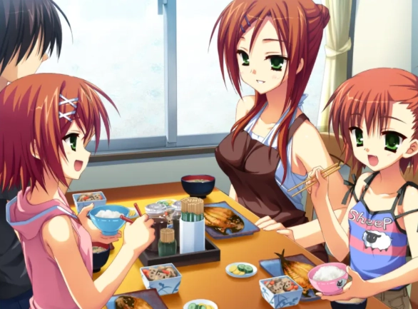 早上,男主被闹钟叫醒,来到厨房,被三好美帆委托叫醒三好姐妹,男主费了好大劲叫醒了睡相很差的三好由比子,再去叫三好双叶的时候,发现三好双叶已经被闹醒了。