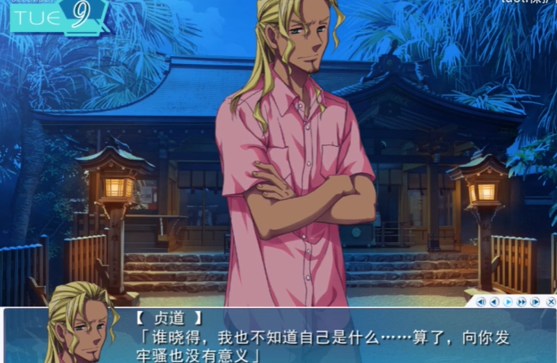 最后,三好姐妹和六角五郎找到了男主,三个人一起追问男主身后的七条沙沙罗是怎么回事,七条沙沙罗解释了一番,正当男主一行四人要把七条沙沙罗送回“医院”的时候,一个凶恶的男人出现。男人自称是七条克己,七条沙沙罗的父亲,要带七条沙沙罗回去。七条沙沙罗临走前打算和男主约定明天再一起出来玩,但是男主还没来及回应,七条沙沙罗就被七条克己拎走了。之后四个人陷入了对七条克己的怀疑中,六角五郎表示七条克己不是岛上神社的神主吗,原来他有女儿的吗?(之后进入七条沙沙罗线)