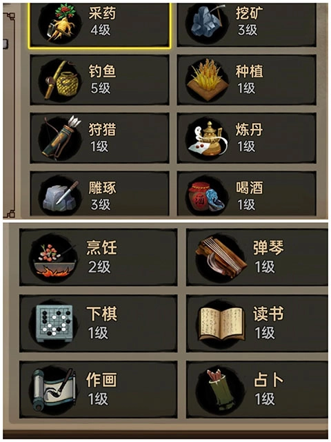 游戏目前一共有14种手艺,他们分别如下图所示。手艺内的各种生活技能,满级均为100级。升到满级需要耗费大量的时间,所以玩家们不要急于求成,循序渐进才是王道。玩家可以根据自己的喜好和心情选择不同的模式或挑战。这样可以增加游戏的可玩性,可以给玩家更好的武林体验。