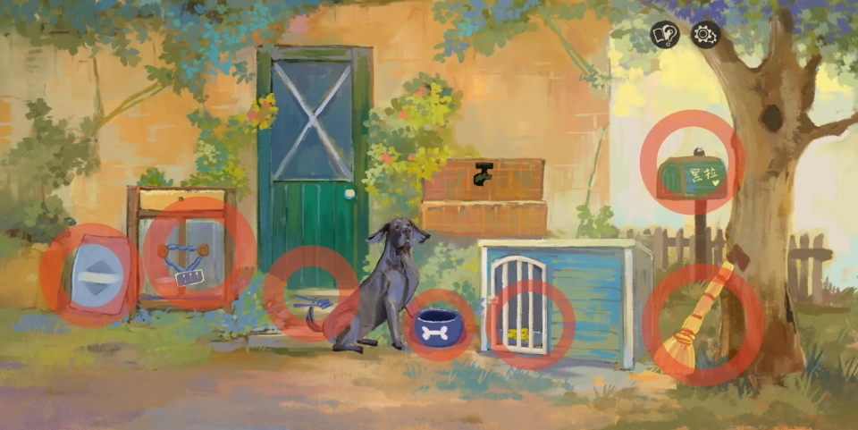 拿走树旁边的扫帚,拿取左边柜子旁的砂灰,捡起狗旁边的开瓶器。