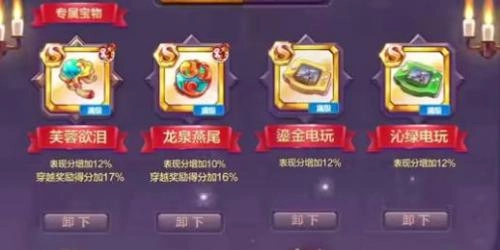 第一种宝物搭配方案:妙法红绦、草莓甜筒、碧蓝之音、冬雪猫猫。这套组合的核心思路是借助第一个宝物的满级属性“飞天玄女”来冲击更高分数。