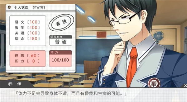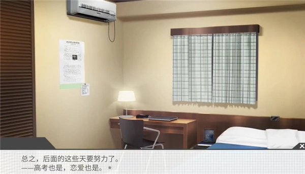 2、第一次约会后,会有一次主角自问自答的选项事件,选项是3个,分别是“一定要考好”,“在一起就好”,“一起努力吧”,选项影响到主角的初始理想值,对应选项分别是高,低,不变,理想值则会影响到学习效率,进而影响一模成绩和之后的路线,因此根据不同的路线选择不同的选项吧。