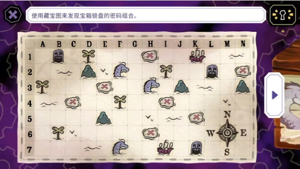 思路:想象自己站在藏宝图的上看向四周,左手是一条龙离你最近,右手是一座山离你第二近,中间是海鸥和椰树,这样看来就在H6格子出向W方向看(H6W)