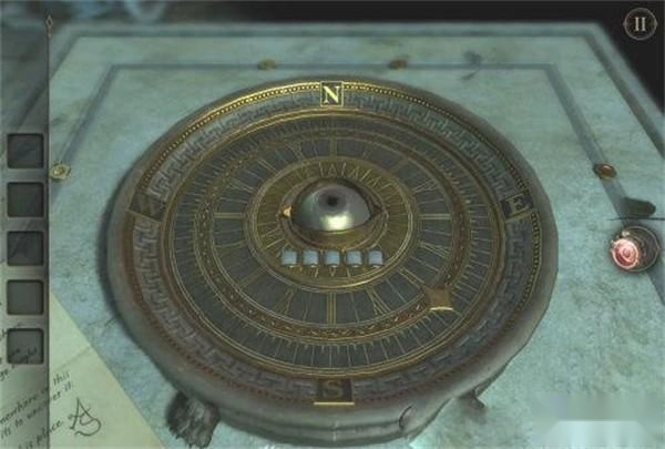 四、取出金属球,放置在桌子中央的圆盘上,接着输入指令“SESWN”。让指针在磁盘上短暂停留片刻,随后会出现带有两个方向箭头的圆形浮雕,按照箭头指示用手指将其拉开,即可获得一块正方形的金属。