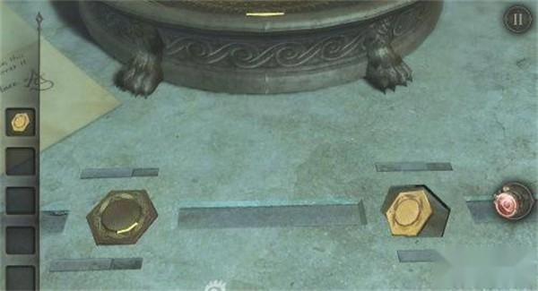 二、切换至另一张八边形桌子,完成拼图后,从圆盒侧面的小抽屉里取出镜片,组合成一副完整的镜片。使用这副镜片观察,会发现隐藏的手印,按下手印即可获得一块六边形金属板。第二块六边形金属板则位于该台子的边缘处。