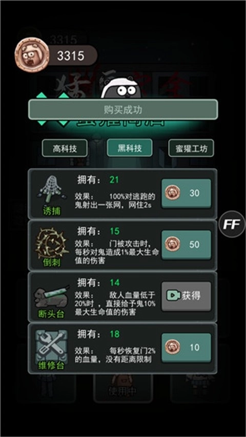 要是你的床和门都已经升到最高级,可还是觉得金币不够用,那就去买些能帮你赚钱的道具。鬼的等级也变得特别高,每次都打不死它,往往打到只剩一点血的时候就让它跑掉了。这种情况下,我特别推荐你买一个诱捕道具——它能把鬼网住2秒,要是再搭配冰箱道具,还能让这个时长增加50%。有了它,就能在鬼要逃走的时候把它网住,这样就能顺利把鬼杀死了。