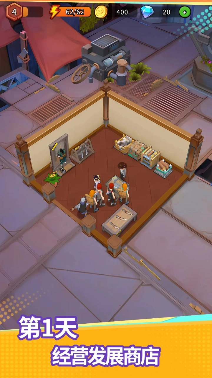 游戏的核心玩法围绕装备道具的制作与售卖展开——通过反复打造已解锁的装备,能够逐步解锁新的装备图纸;而每次制造装备时,其最终的品级会带有一定的随机性。和其他模拟经营类游戏相似,玩家可以自由布置店内的各类设施,还能对店面进行扩张,最终可拓展至一片相当大的区域。此外,游戏还设有外出探索的内容:探索队伍由一名英雄和两名幸存者组成,选定目标地点后,玩家可以为队伍配置强化剂与载具。