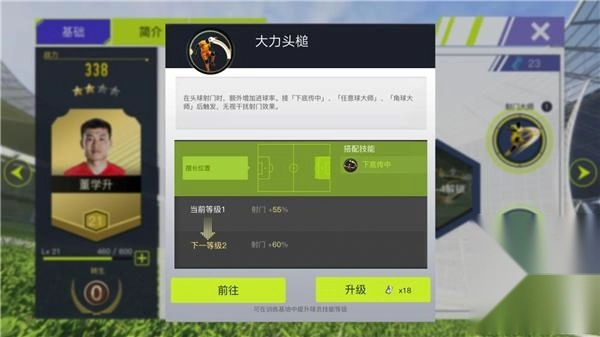 到了游戏中期,就得考虑技能之间的配合了。就像图里展示的,球员董学升身高优势明显,还具备大力头槌技能,不过这个技能得在接到底传中、任意球大师或者角球大师的传球时才会触发。所以在搭配阵容的时候,要多安排些有这类技能的球员,这样才能让董学升的大力头槌充分发挥作用。