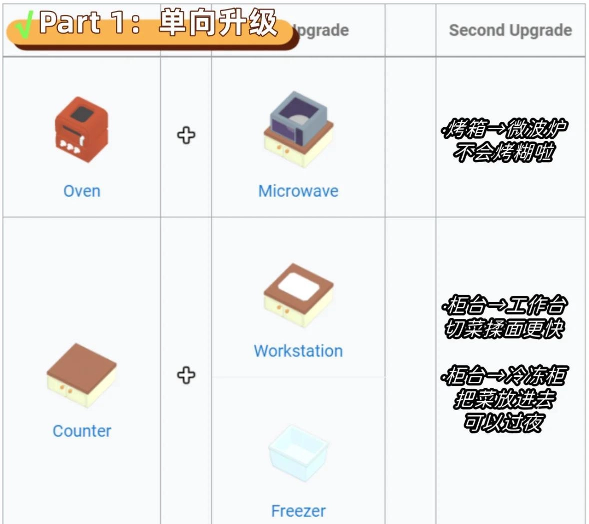 循环升级:可以反复升级,相互转换。例如普通炉灶可以升级成安全炉灶或危险炉灶,安全炉灶可以升级成危险炉灶,危险炉灶可以升级成安全炉灶,但是都无法降级成普通炉灶。