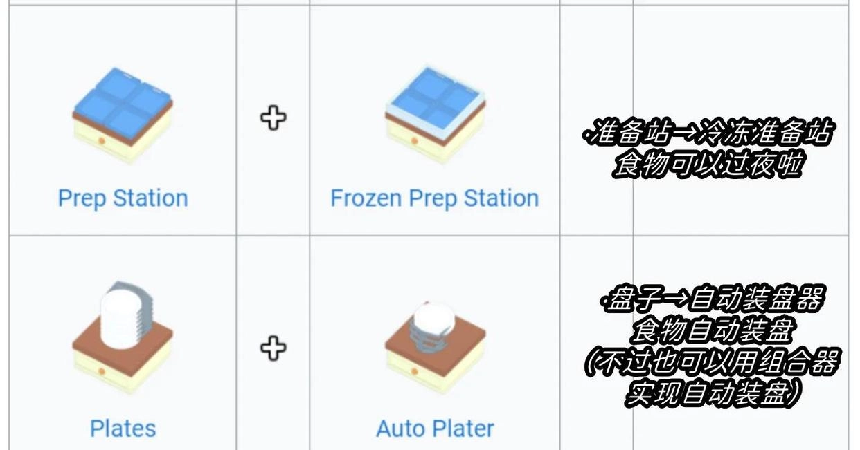 关于搅拌机的使用:1 急速搅拌器速度更快(加上传送带时间也比2更快),2 传送搅拌机可节省智能抓取器,3 加热搅拌器能烹饪肉饼,但效率较低(火力0.4)。