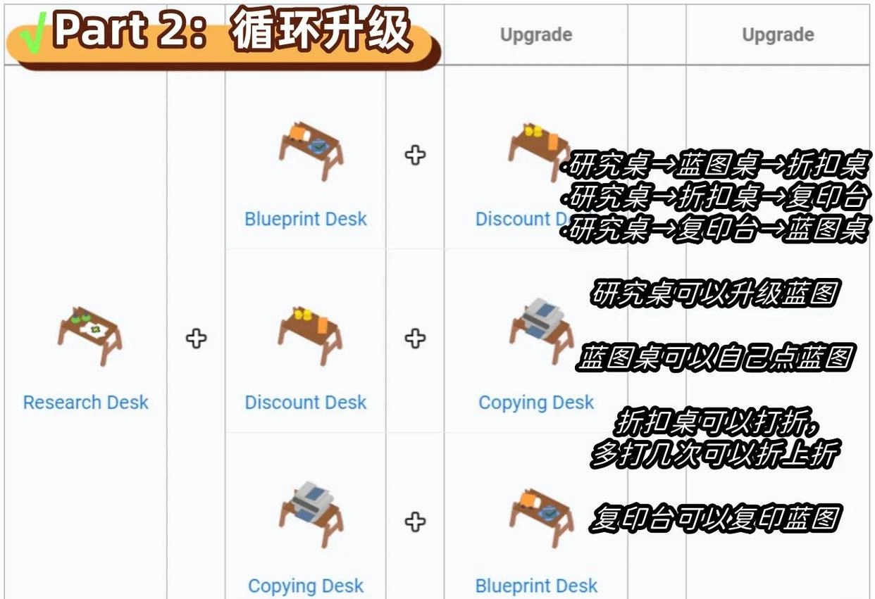 研究桌一系列:我推荐开启的顺序是:研究桌、复印台、蓝图桌、折扣桌。复印台超级重要!配套的蓝图柜也很重要,能开几个就开几个!