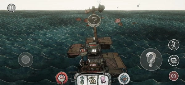 把角色操控到木筏前端,这时候右边的操作集合按钮会神奇地变成鱼钩的样子,通过辅助线的精准指引,就可以轻松钩到想要的垃圾了。