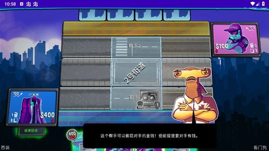 6、每个卡牌都有不同的技能,比如说这个帮手可以偷窃对手的金钱!但前提是要对手有钱。