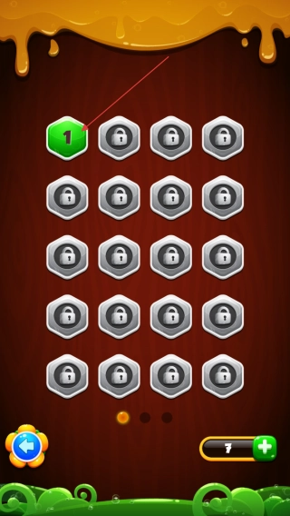 3、在关卡选择界面,点击标有数字的六边形关卡,点击【1】进入,需依次解锁后续关卡。